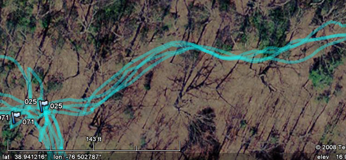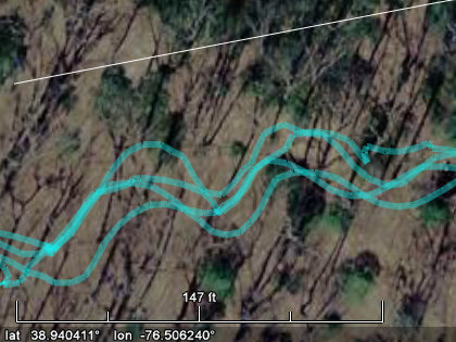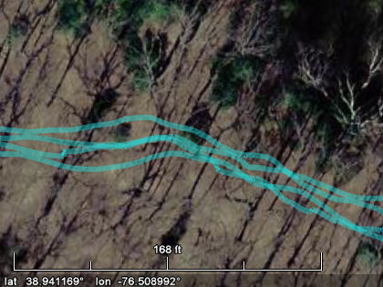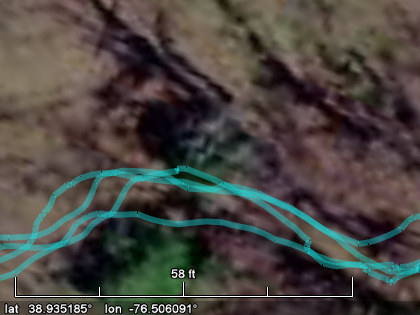 Occasionally the trail might be slightly visible in the imagery, and you can blink the track log lines on and off to help you fine-tune the trail path. Do this by hovering the mouse over the "check box" for all the track logs in the "Places" sidebar, then clicking the mouse repeatedly while staring at the imagery. As you repeatedly check/uncheck the track log check box, the track log lines repeatedly appear/disappear on the screen. You might discover that the trail is faintly visible (see below).